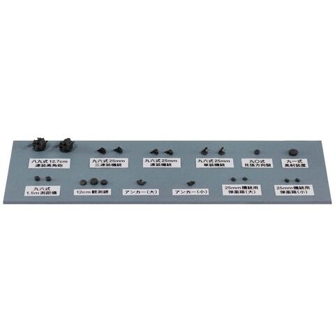八九式12.7cm連装高角砲×8 九六式25mm三連装機銃×14 九六式25mm連装機銃×12 九六式25mm単装機銃×20 九〇式見張方位盤×4 九一式高射装置×2 九六式1.5m測距儀×4 12cm観測鏡 3種×各2 アンカー(大×4 アンカー(小)×4 25mm機銃用弾薬箱 大小×各8