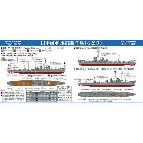 六年式53cm連装魚雷発射管は半シールド付きへ変更 1936年の復原性能改善工事時、大戦後期の対空、対潜兵装を増備した状態のいずれかを選択して製作可能 千鳥型水雷艇全4隻の艦名デカール付属(艦尾:ひらがな/舷側:カタカナ):千鳥(ちどり)、真鶴(まなづる)、友鶴(ともづる)、初雁(はつかり)
