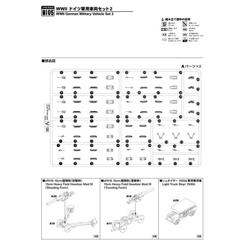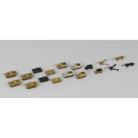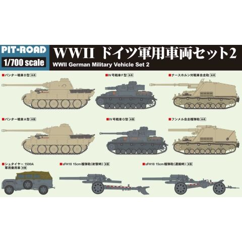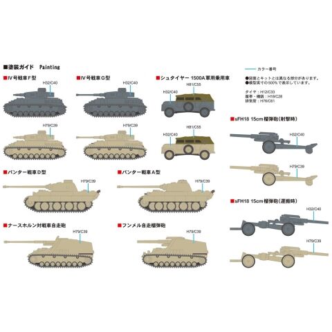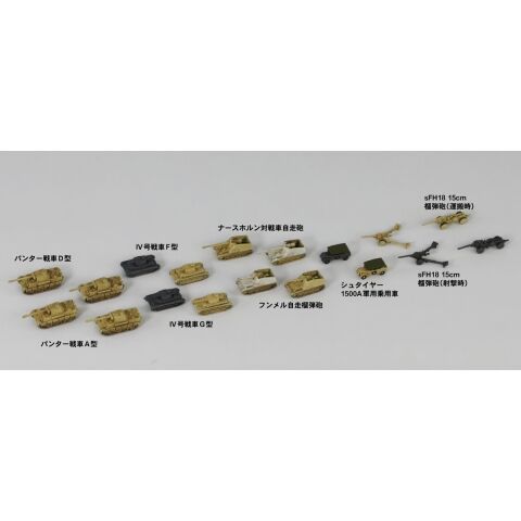 パンター戦車D型(全長:12.8mm)×4 パンター戦車A型(全長:12.8mm)×6 IV号戦車F型(全長:8.4mm)×4 IV号戦車G型(全長:9.3mm)×6 シュタイヤー1500A軍用乗用車(全長:7.0mm)×8 ナースホルン対戦車自走砲(全長:11.8mm)×4 フンメル自走榴弾砲(全長:9.3mm)×4 sFH18 15cm榴弾砲(射撃時/全長:11.5mm)×6 sFH18 15cm榴弾砲(運搬時/全長:12.9mm)×6