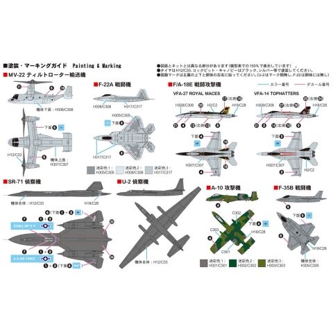 MV-22 オスプレイ、F-22A ラプター等の現用の最新鋭機から、永らく使われてきたA-10 サンダーボルトII、U-2/TR-1ドラゴンレディ 及び、往年の名機 SR-71 ブラックバード まで、幅広く人気のアメリカ軍用機をチョイスしたセットです。