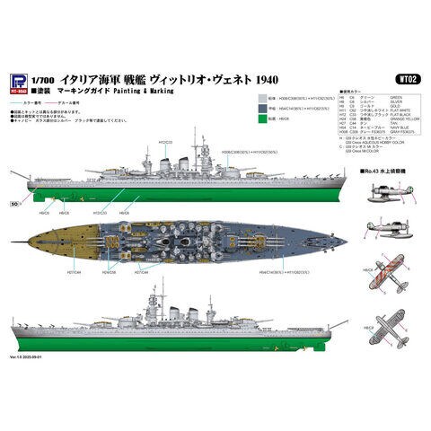 1/700スケールプラモデル 洋上モデル/フルハルモデル選択可能 船体、甲板、上構物等、同型艦ローマとの違いを再現。 ファンネルキャップ、クレーン、運搬台車等のエッチングパーツ付き。 Ro.43水上偵察機×2付属 1隻入り