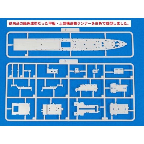 従来の「れいめい」プラモデルは、船体色(白)/甲板色(緑)/艦底色(赤)の3色成型のパーツ構成でしたが、白色成型版では甲板、上部構造物ランナーも白色で成型しました。