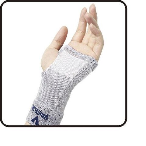 手の甲と手のひらのサンドウィッチ型テーピング編みが、添え木のように手首の過度な動きを抑制し、不安感を軽減します。