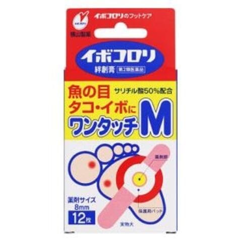 | 被覆してある剥離紙をはぎ取り、中央部のサリチル酸絆創膏が患部を覆うように貼り付けます。 ※裏面〈イボコロリ絆創膏の上手な使い方〉をご覧ください。 〈イボコロリ絆創膏の上手な使い方〉 1.患部を清潔に乾いた状態にします。 ※入浴後、患部をよく拭いてからご使用になると一層効果的です。 2.本品を剥離紙からはがして、薬剤部を患部にあて、ずれないようにしっかり密着させ2~3日貼り続けます。薬剤部から有効成分サリチル酸が浸透し、患部が白く変化してきます。 ※薬剤部が患部からずれたり、入浴等で絆創膏がはがれた場合は貼り替えてください。ぬれた場合は水分をよく拭き取ってご使用ください。 3.白く軟化しはがれ始めた患部をピンセット等で痛みを感じない程度に取り除いてください。患部をお湯につけると取り除きやすくなります。 ※痛む場合は無理に取り除かないでください。 4.患部が完全に取れるまで1.~3.の要領で繰り返しご使用ください。患部が取れた後、皮膚は自然に再生されます。 ※魚の目はしん(角質柱)を完全に取り除かないと再発します。 ※イボを取り除くと滑らかな皮膚が見えてきます。 貼付例:魚の目の場合 1.定められた用法及び用量をお守りください。 2.本剤は外用にのみ使用し、内服しないでください。 3.小児に使用させる場合には、必ず保護者の指導監督のもとに使用させてください。 4.薬剤が健康な皮膚に付着すると、その部分も白く軟化し、痛んだりするので、患部からずれないように使用してください。 5.薬剤部が患部よりひとまわり小さいサイズをお選びください。 6.一度に全部の患部に使用せず、1ヶ所ずつ使用してください。 |