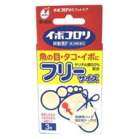 | サリチル酸絆創膏を患部の大きさに合わせて切り、患部を覆うように貼り付けます。次に魚の目など圧迫や接触で痛むときには、患部の大きさに合ったパッドを選び、必要に応じて貼ります。さらに、固定用テープで固定します。 ※裏面〈イボコロリ絆創膏・Fの上手な使い方〉をご覧ください。 〈イボコロリ絆創膏・Fの上手な使い方〉 1.患部を清潔に乾いた状態にします。サリチル酸絆創膏を患部の大きさに合わせて切り、患部に貼ります。 ※入浴後、患部をよく拭いてからご使用になると一層効果的です。 ※サリチル酸絆創膏が健康な皮膚につかないように患部よりひとまわり小さく切ってください。 2.圧迫や接触で患部が痛む場合は、患部の大きさに合った保護用パッドを選び、1枚もしくは必要に応じて2枚重ねて貼ります。 3.固定用テープを貼り、サリチル酸絆創膏がずれないようにしっかり密着させます。 4.2~3日貼り続けますと有効成分サリチル酸が浸透し、患部が白く変化してきます。 ※サリチル酸絆創膏が患部からずれたり、入浴等で絆創膏がはがれた場合は貼り替えてください。ぬれた場合は水分をよく拭き取ってご使用ください。 5.白く軟化しはがれ始めた患部をピンセット等で痛みを感じない程度に取り除いてください。患部をお湯につけると取り除きやすくなります。 ※痛む場合は無理に取り除かないでください。 6.患部が完全に取れるまで1.~5.の要領で繰り返しご使用ください。患部が取れた後、皮膚は自然に再生されます。 ※魚の目はしん(角質柱)を完全に取り除かないと再発します。 ※イボを取り除くと滑らかな皮膚が見えてきます。 1.定められた用法及び用量をお守りください。 2.本剤は外用にのみ使用し、内服しないでください。 3.小児に使用させる場合には、必ず保護者の指導監督のもとに使用させてください。 4.薬剤が健康な皮膚に付着すると、その部分も白く軟化し、痛んだりするので、患部からずれないように使用してください。 5.サリチル酸絆創膏は患部よりひとまわり小さく切ってください。 6.一度に全部の患部に使用せず、1ヶ所ずつ使用してください。 |
