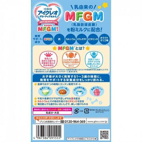・グローアップミルクは、発育に大切なMFGMに加え、不足しがちな鉄、カルシウムの吸収を助けるビタミンDなどを配合。