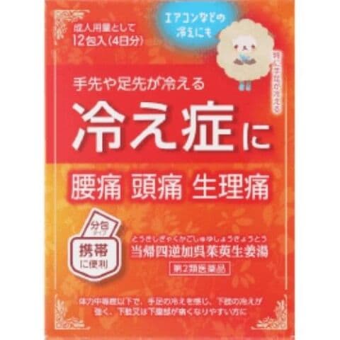| 3包(6.0g)中 当帰四逆加呉茱萸生姜湯乾燥エキス散4.48gを含有しています。 (日局トウキ・・・2.4g 日局シャクヤク・・・2.4g 日局サイシン・・・1.6g 日局タイソウ・・・4.0g 日局ショウキョウ・・・0.8g 日局ケイヒ・・・2.4g 日局モクツウ・・・2.4g 日局カンゾウ・・・1.6g 日局ゴシュユ・・・1.6g) 上記生薬量に相当します 添加物として、二酸化ケイ素、ステアリン酸Mg、ショ糖脂肪酸エステル、乳糖水和物を含有しています。 |