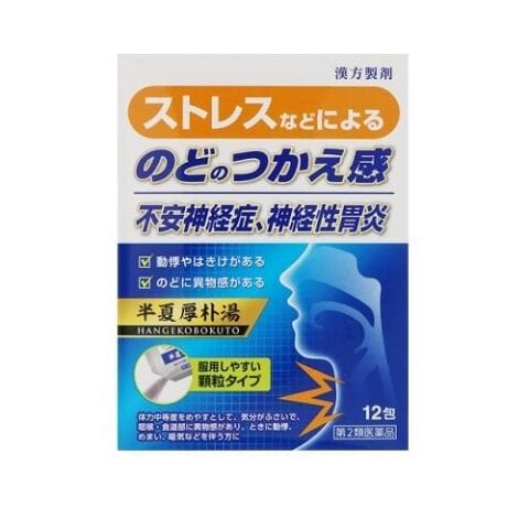 | 体力中等度をめやすとして、気分がふさいで、咽喉・食道部に異物感があり、ときに動悸、めまい、嘔気などを伴う次の諸症:不安神経症、神経性胃炎、つわり、せき、しわがれ声、のどのつかえ感 |