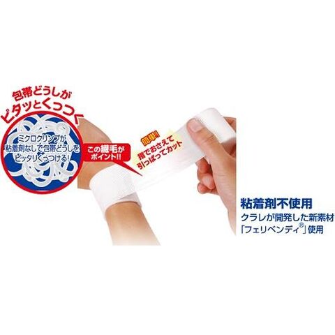 「ミクロクリンプ」と呼ばれる細かい繊維が、しっかり絡み合って包帯どうしをくっつけます。