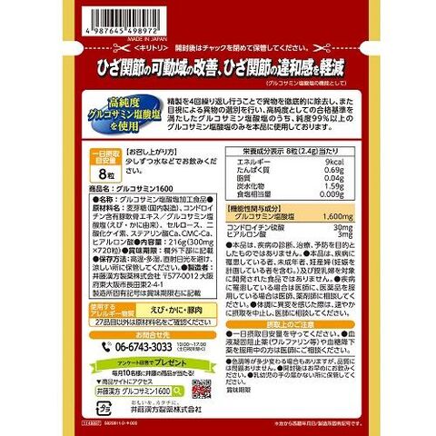 グルコサミン(高純度) 1600mg、コンドロイチン硫酸 30mg、ヒアルロン酸 3mg