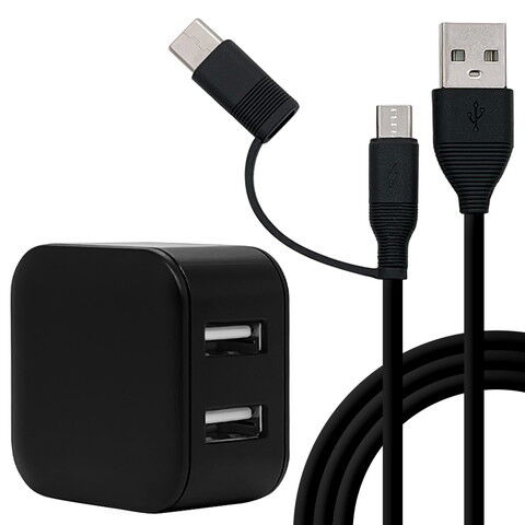 ◆Type-C変換アダプタ付きUSBケーブルとUSB Type-Aポートを2個搭載した最大出力 5V/2.4AのAC充電器のセット製品です。