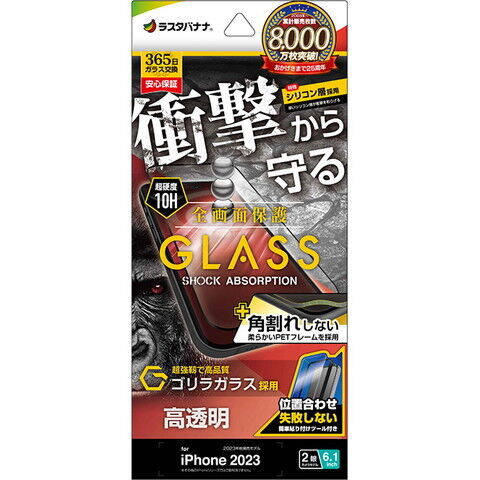 ラスタバナナ iPhone15(6.1inch/2眼)用 液晶保護ガラスフィルム 全画面保護 衝撃吸収+角割れしない3Dソフトフレーム ゴリラガラス 高光沢 治具付 SGSA3894IP361 【返品種別A】