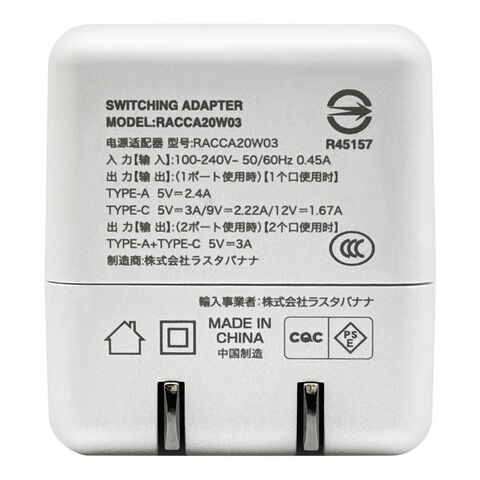 - [出力]USB Type-C:5V/3A9V/2.22A12V/1.67A、USB Type-A:5V/2.4A、 2ポート同時出力時:最大合計15W