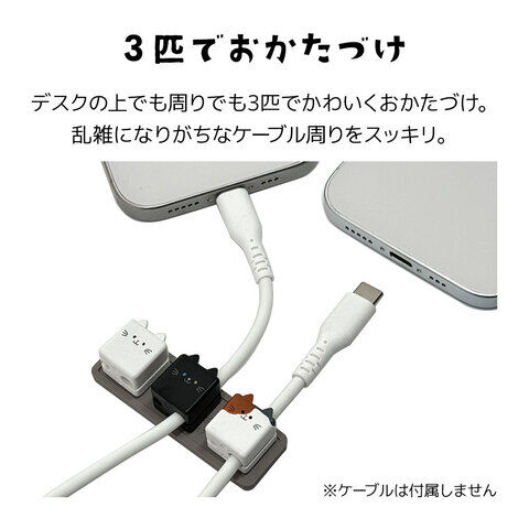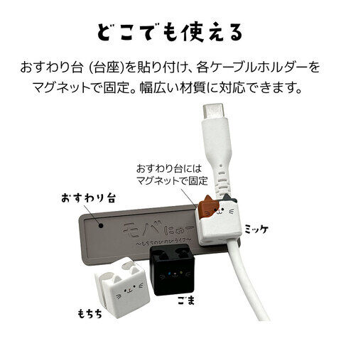 - 梱包内容:ケーブルホルダー×3 (もちち、ごま、ミッケ各1)、おすわり台 (台座)×1