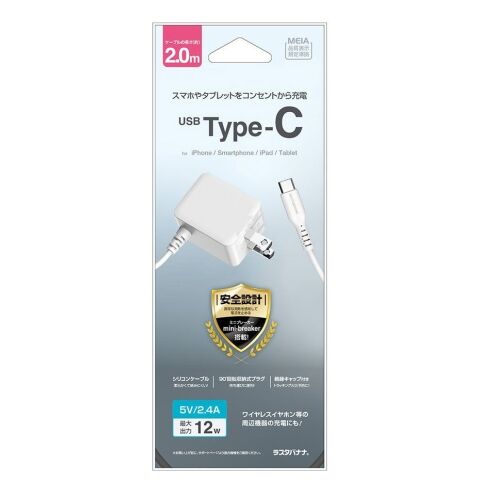 ラスタバナナ Type-C ケーブル直付 AC充電器 Mini-Breaker付 2.4A(2m・ホワイト) R20ACC2A04WH 【返品種別A】