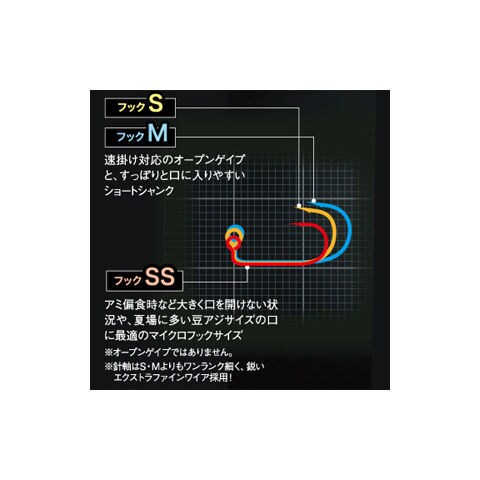 S・Mは速掛け対応のオープンゲイプ、SSは小さなアタリに対し刺さりをフォローする針先ネムリ使用