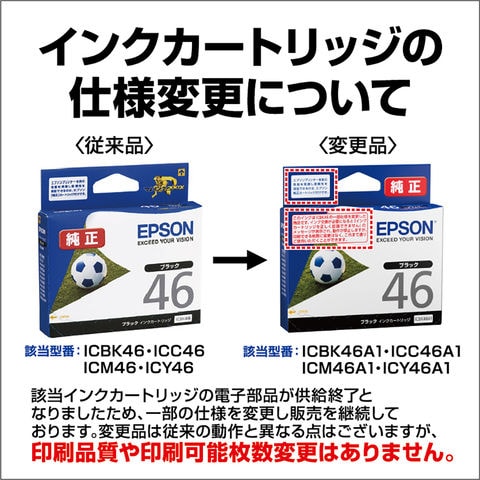 このインクはICM46の一部仕様を変更した商品です。印刷品質や印刷可能枚数に変更はありません。プリンター本体の動作が従来と異なる点がございますが、問題なくお使いいただけます。