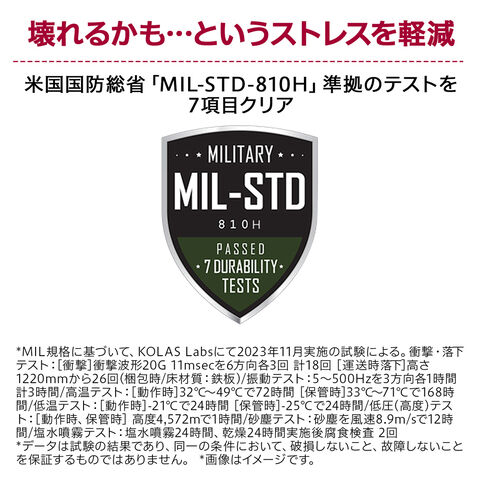 厳しい環境下での使用を想定した米国国防総省「MIL-STD-810H」準拠のテストを7項目クリア*。