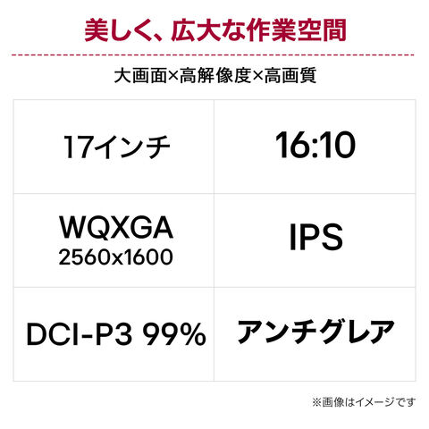2560×1600(WQXGA)の高解像度、縦横比16:10、17インチの大画面が広大な作業領域を提供。