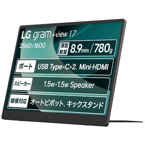 LGエレクトロニクス|エルジー モバイル液晶ディスプレイ(17型/IPS/WQXGA 2560×1600/60Hz/30ms/MiniHDMI/USB Type-C/3年保証) gram +view 17MT70 【返品種別A】