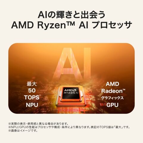 AMD Ryzen AI 5 435 プロセッサとAMD Radeonグラフィックスによる高速な応答性に加え、AI処理を担うNPUが、