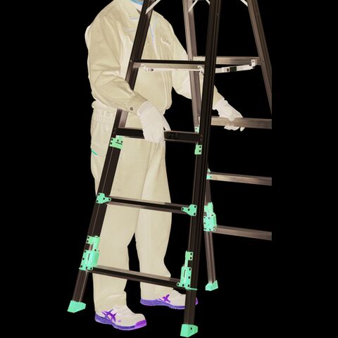 ◆立ったまま伸縮でき、ワンタッチで折りたたみができる上部操作式の専用脚立です。