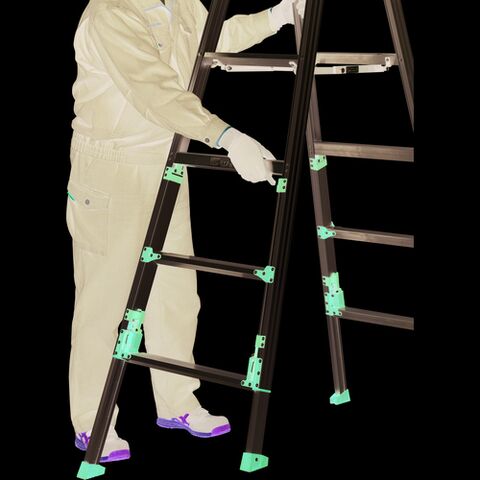 ◆立ったまま伸縮でき、ワンタッチで折りたたみができる上部操作式の専用脚立です。