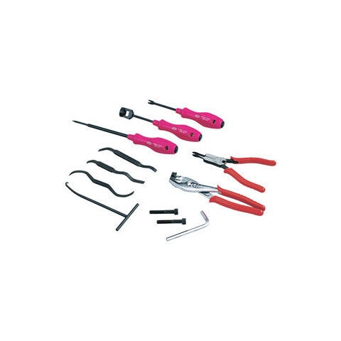 ◆自動車に使用されているドラムブレーキの分解、組付、調整作業に使用する専用工具のセット。