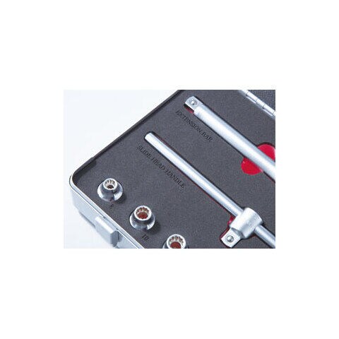 ◆ソケット収納部にはサイズ、その他工具の収納部には工具の種類がマーキングされているため、収納箇所が一目でわかるようになっています。