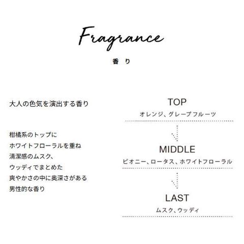 柑橘系のトップにホワイトフローラルを重ね、清潔感のムスク、ウッディでまとめた、爽やかさの中に奥深さがある男性的な香り。