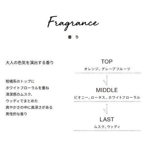 柑橘系のトップにホワイトフローラルを重ね、清潔感のムスク、ウッディでまとめた、爽やかさの中に奥深さがある男性的な香り。