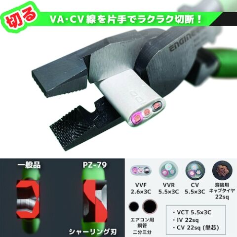 ◆鋭利なせん断刃で、VVFφ2.6mm×3芯をラクラク切断できます。