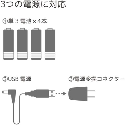 - 電源:AC100V、USB電源、単3乾電池×4本(別売)