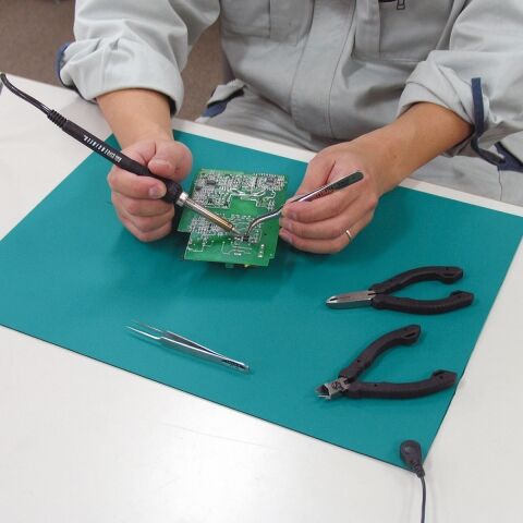 ◆コードをアースに接続すれば、マットに接触させるだけで人体や工具、電子部品に溜まった静電気を除去します。
