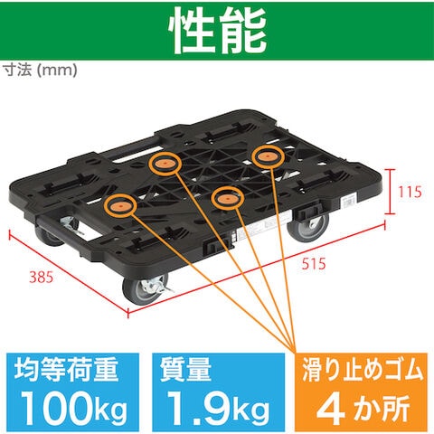 トラスコ中山 樹脂製平台車 ルートバンメッシュタイプ 515×385 自在側ストッパー付(黒) MPK-500S-BK 【返品種別B】