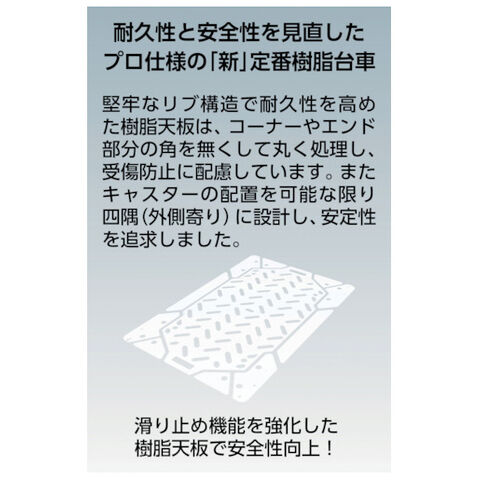 ◆堅牢なリブ構造で耐久性に優れた樹脂台車です。