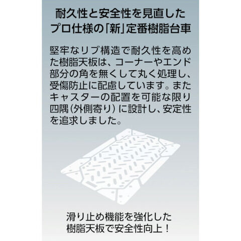 ◆堅牢なリブ構造で耐久性に優れた樹脂台車です。