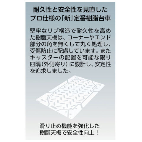 ◆堅牢なリブ構造で耐久性に優れた樹脂台車です。