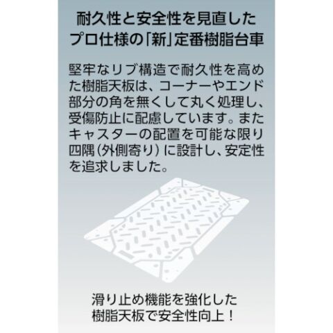 ◆樹脂製省音キャスターの採用により走行音を抑えた静かな台車です。