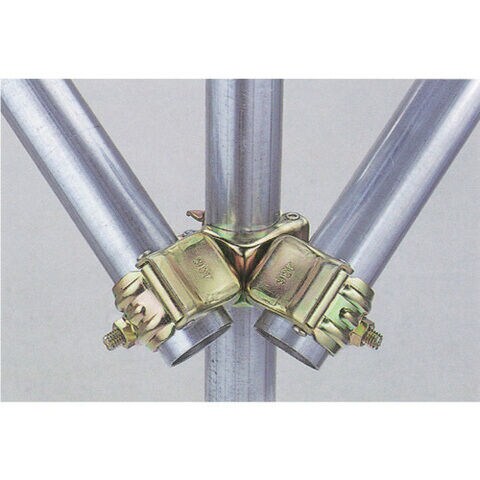 ◆単管と単管で小屋等の組立時の垂直パイプに補強用斜め2方向を外側固定するクランプです。