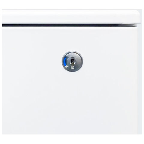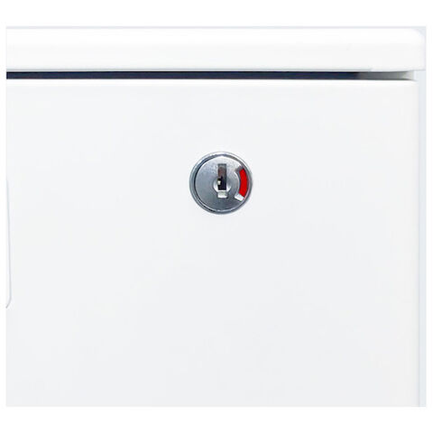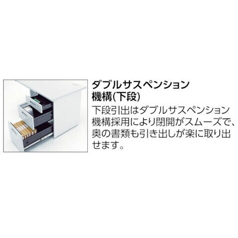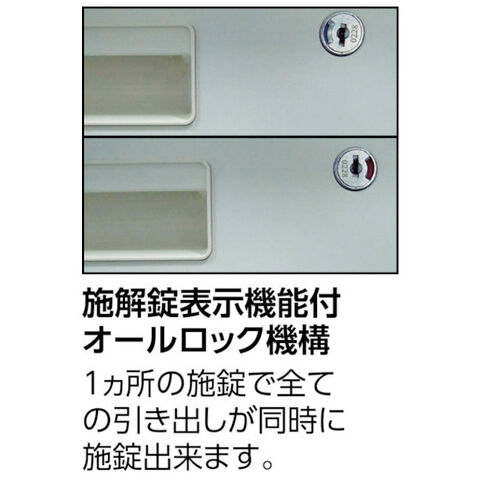 ◆上段引出しの施錠で全ての引出しのが同時にロックされるオールロック錠を採用しています。一目で施錠確認できる開閉表示付です。