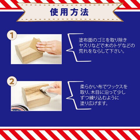 ※ワックスの表面に白い点のようなものが出ることがありますが、これはろう(蜜蝋やカルナバ)の成分が析出し浮き出たもので不具合ではありません。そのままご使用いただけます。