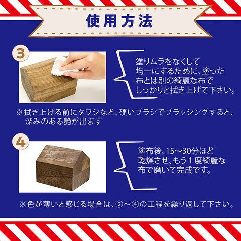 ◆ウエスやスポンジで木部に塗りこむとアンティーク調のカラーに着色ができ、同時に塗装面の保護もできます。