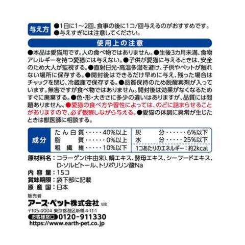 ■原材料:コラーゲン(牛由来)、鯛エキス、酵母エキス、シーフードエキス、D-ソルビトール、トリポリリン酸Na