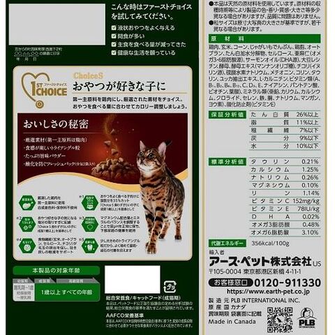 ◆脂肪分35%カット。おやつを食べる子向けに脂肪分を35%カット。※(「Choice S 食わずぎらいの子に成猫用1歳以上」を基準として)