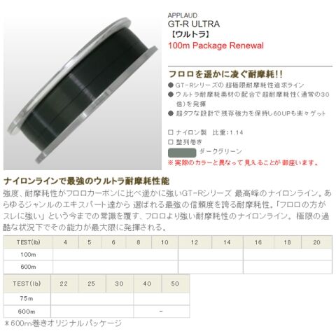 強度、耐摩耗性がフロロカーボンに比べ遥かに強いGT-Rシリーズ最高峰のナイロンライン。