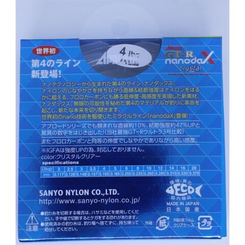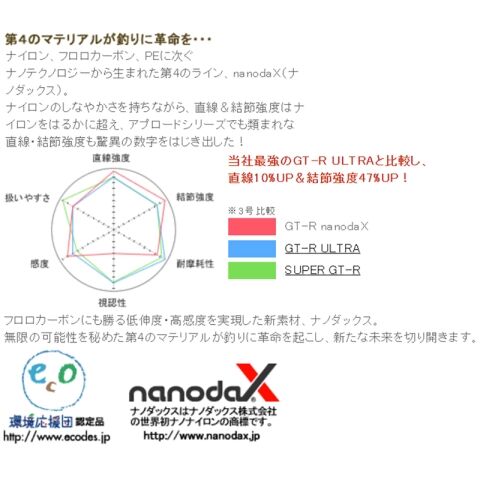 当社最強ラインGT-Rウルトラより、直線約10%UP、結節約47%UP。300mは通常巻きで75mマーク付き、nanodaX(ナノダックス)製品、比重 1.14。