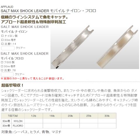 サンヨーナイロン ソルトマックス ショックリーダー モバイル ナイロン 30m クリア(20lb/5号相当) APPLAUD ナイロンリーダー ソルトマックス ショックリーダー モバイル ナイロン 30m(20lb/5ゴウ) 【返品種別B】