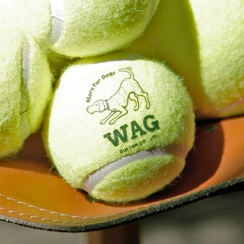 ◆ボールを投げて! と言わんばかりの愛らしいロゴが入った犬用テニスボール。