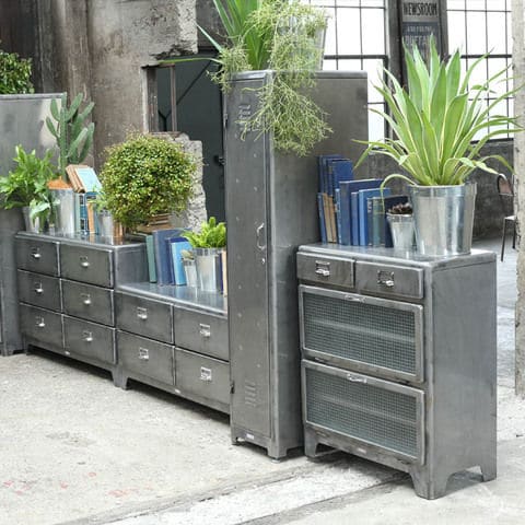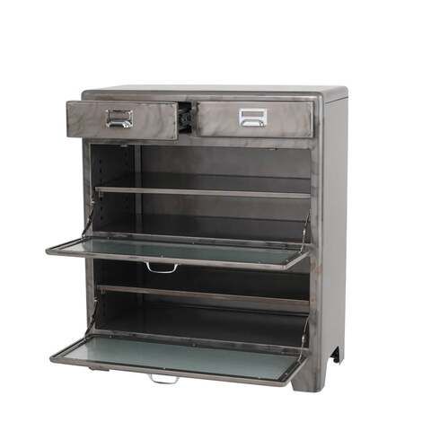 ドロワー2杯とガラス付き下開き扉2段のコンビネーションが、独創的なアイテム。